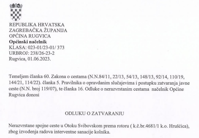 Odluku o zatvaranju nerazvrstane ceste Otok Svibovski