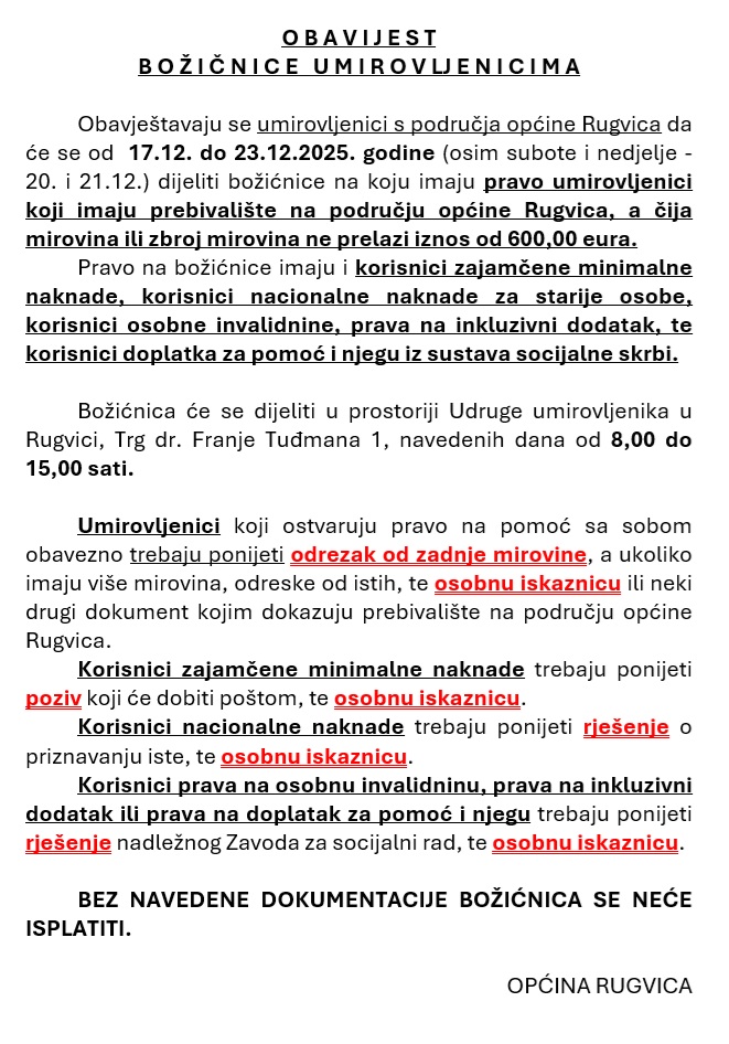 - Korisnici socijalnih naknada dobit će božićnicu u iznosu od 65,00 EUR.